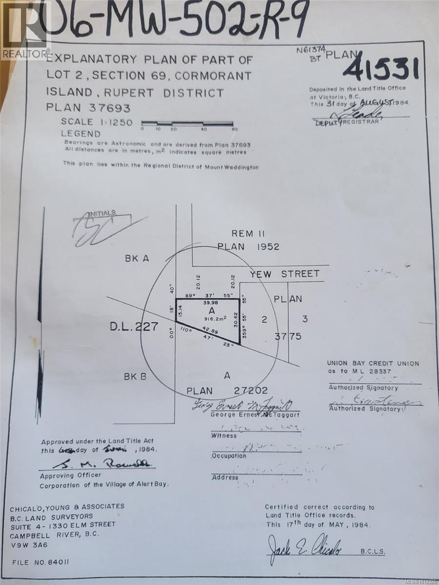 Escape to the natural beauty of Alert Bay with this charming .226-acre wooded lot. Nestled among mature trees and just moments from the ocean, this property offers a peaceful backdrop for your vision—whether it’s a private getaway, vacation retreat, or full-time island home. Embrace the calm, coastal lifestyle that only Alert Bay can offer. (id:6289)