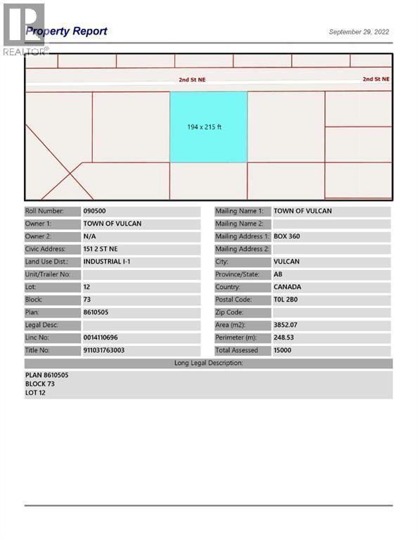 Industrial lot for sale in the Town of Vulcan Industrial Subdivision. Here is an opportunity to purchase one, or more industrial lots, at an affordable price to set up your business. Term of sale - within 12 months from the closing date, a development agreement is to be completed, and construction on the property shall commence within 12 months of the date of the execution of the development agreement. (id:6289)