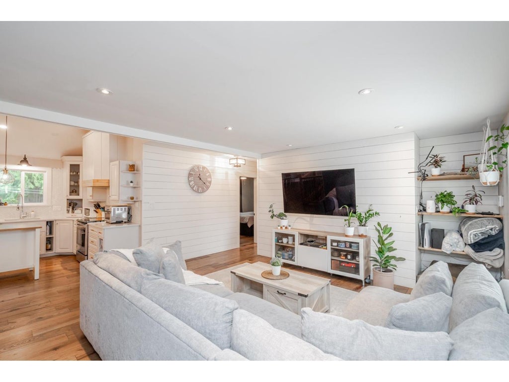 Beautifully updated 5 bed, 3 bath home offers exceptional value and comfort in one of Abbotsford's most family-friendly neighbourhoods. Hardwood flooring and an expansive open-concept layout connecting the living, kitchen, and dining areas. Vaulted ceilings, custom cabinetry, and tasteful shiplap accents create a warm, welcoming atmosphere. Walk out through French doors to the private deck-ideal for outdoor entertaining/cooking. Primary suite has been thoughtfully redesigned to include a luxurious ensuite featuring marble double sinks. Downstairs has 3 bedrooms, 5pc bathroom, large laundry, flex and storage room. With generous-sized bedrooms and three full bathrooms, there's ample space for a growing family or guests. Fully fenced spacious yard has fruit trees and a generous storage shed! (id:6289)