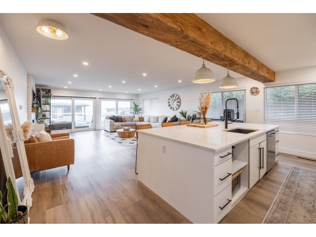 Welcome to WHITE ROCK! Introducing this charming beach house, featuring 4 beds and 3 baths - perfect for a family! The exterior includes a fenced yard with artificial turf and extra pad parking for 2 cars. This 2 storey residence accentuates open-concept living, with a kitchen and living room crafted for entertaining. The kitchen boasts an island that merges with the living area, leading to a balcony that captures a breathtaking view of the ocean. Interior details such as brickwork, reclaimed wood beams, and updated fixtures contribute to the home's distinctive charm. Below is a fully equipped new suite ready for a mortgage helper or for your inlaws! Immerse yourself in this lifestyle, steps away from 5 corners, the beach, restaurants, and amenities this vibrant communities offers! (id:6289)