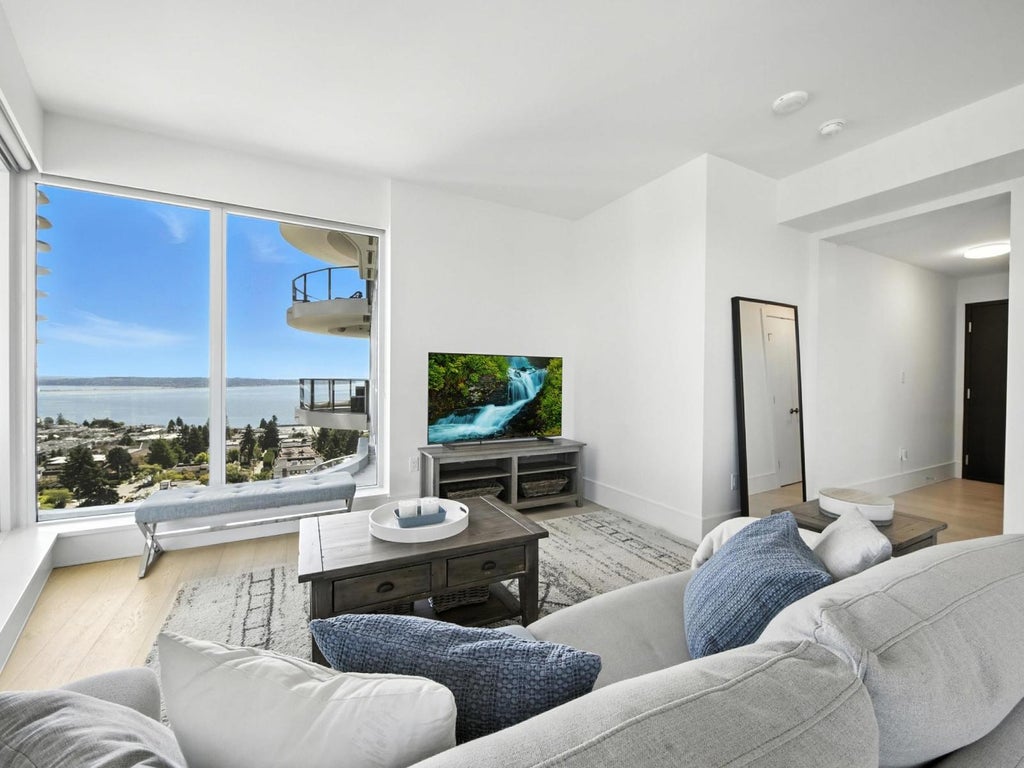 Ocean views with modern, urban living! Upscale condo offers bright, neutral colours and high-end luxuries. Spacious 1 bedroom PLUS den features, a stunning kitchen with marble counters, high end Miele appliances incl gas cooktop, panelled fridge and dishwasher, wall-oven and under-counter microwave. South-facing ocean and mountain views from the open concept living room. Large primary bedroom and gorgeous bathroom with tiled shower and deep soaker tub. It's all about lifestyle with unmatched amenities including a heated indoor/outdoor lap pool, hot tub, fitness, steam room and sauna, billiards, table tennis, EV chargers and more. Walk to the pier, groceries, and all conveniences. "The ocean stirs the heart, inspires the imagination and brings eternal joy to the soul." Robert Wyland. (id:6289)